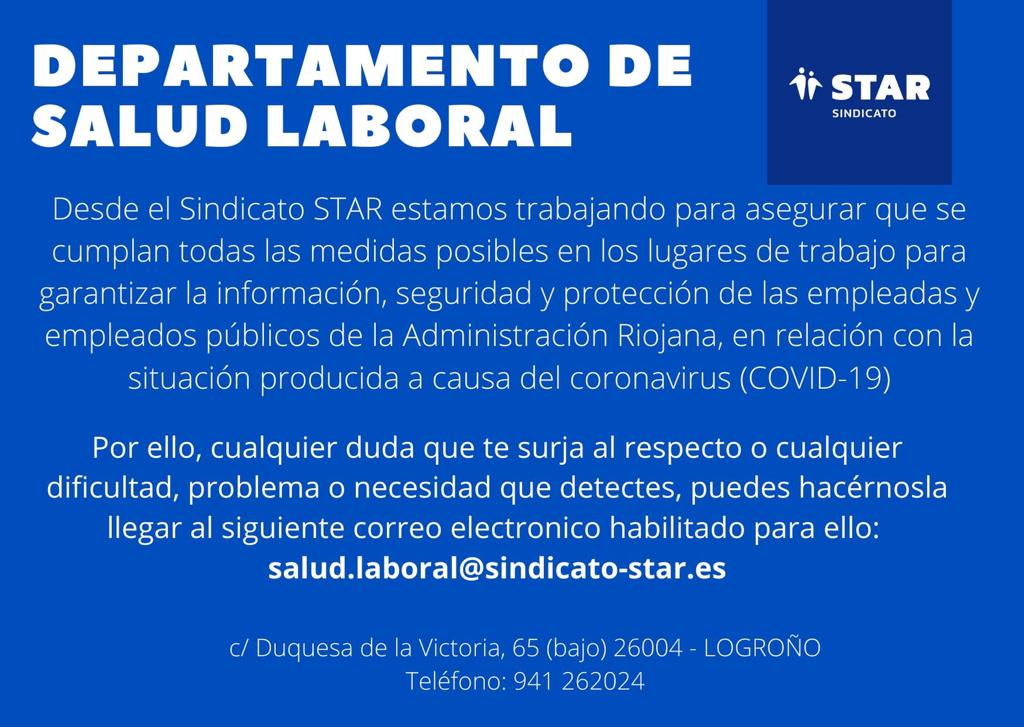 Desde el Sindicato STAR seguimos trabajando y actualizando la información (VER ACTUALIDAD) en relación con la situación a causa del coronavirus COVID-19. Cualquier duda que te surja al respecto, o cualquier dificultad o problema que detectes en tu centro de trabajo puedes hacérnosla llegar a través de Esta dirección de correo electrónico está siendo protegida contra los robots de spam. Necesita tener JavaScript habilitado para poder verlo.