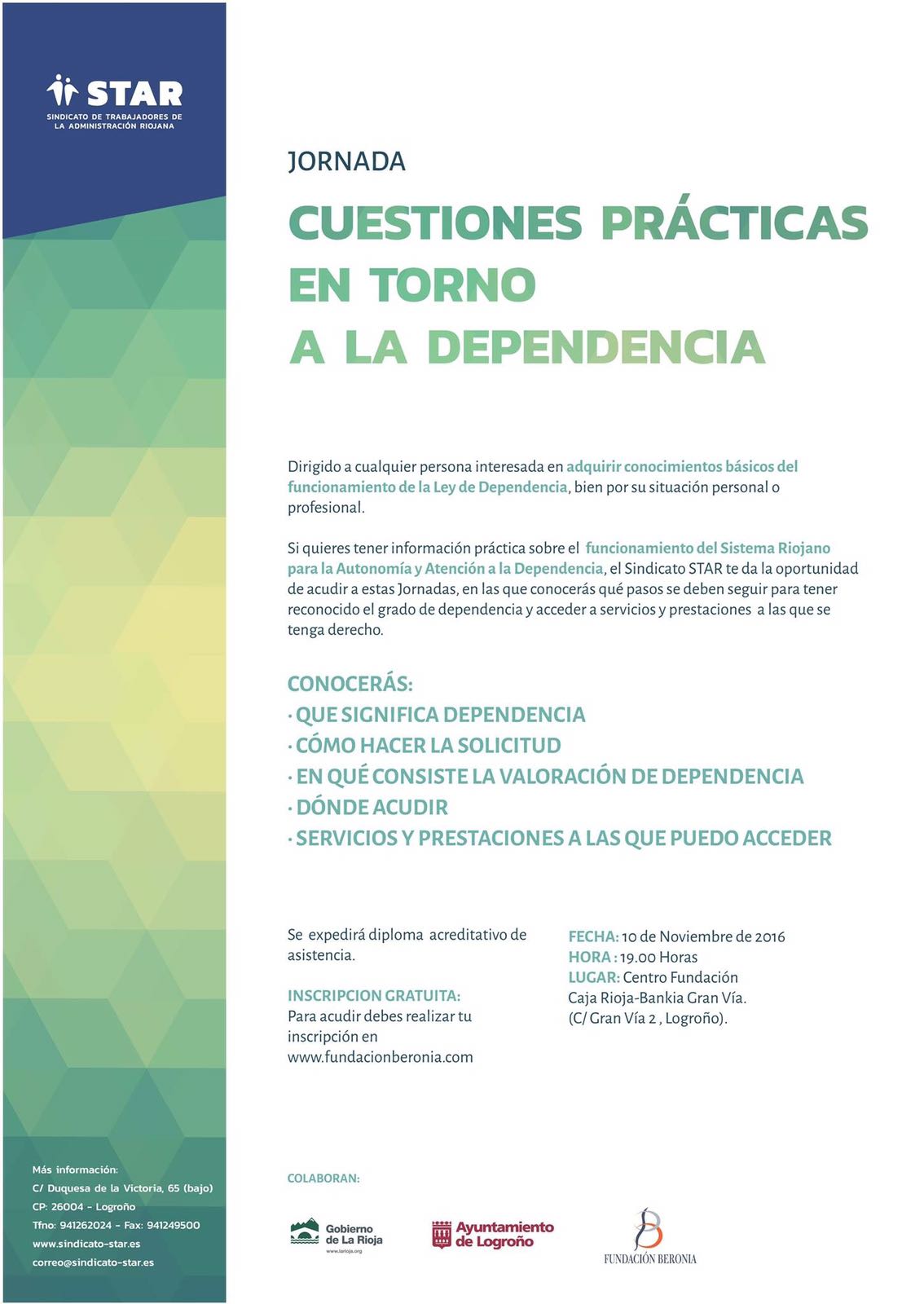 Si quieres tener información práctica sobre el funcionamiento del Sistema Riojano para la Autonomía y Atención a la Dependencia, el Sindicato STAR te da la oportunidad de acudir a esta Jornada. Dirigida a cualquiera que esté interesado en adquirir conocimientos básicos del funcionamiento de la Ley de Dependencia, bien por su situación personal o profesional.