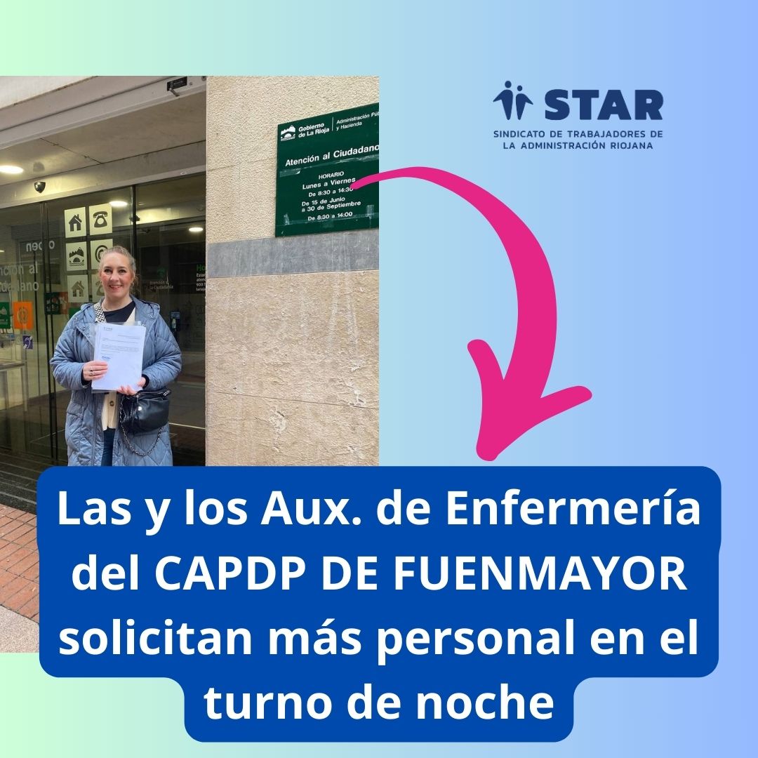 En la mañana de hoy se ha registrado el escrito de las y los Auxiliares de Enfermería del CAPDP "Santa Lucía" de Fuenmayor, en el que se solicitan dos auxiliares por cada módulo en el turno de noche.