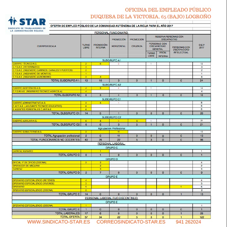 Esta mañana en Mesa Sectorial de Servicios Generales y Comité de Empresa de la CAR ha sido aprobada la Oferta de Empleo Público 2017 para la Administración General de la Comunidad Autónoma de La Rioja. Para cualquier consulta al respecto ponte en contacto con nuestro Sector de Servicios Generales, así como con nuestro Departamento de Formación si estás interesado en la preparación de oposiciones.