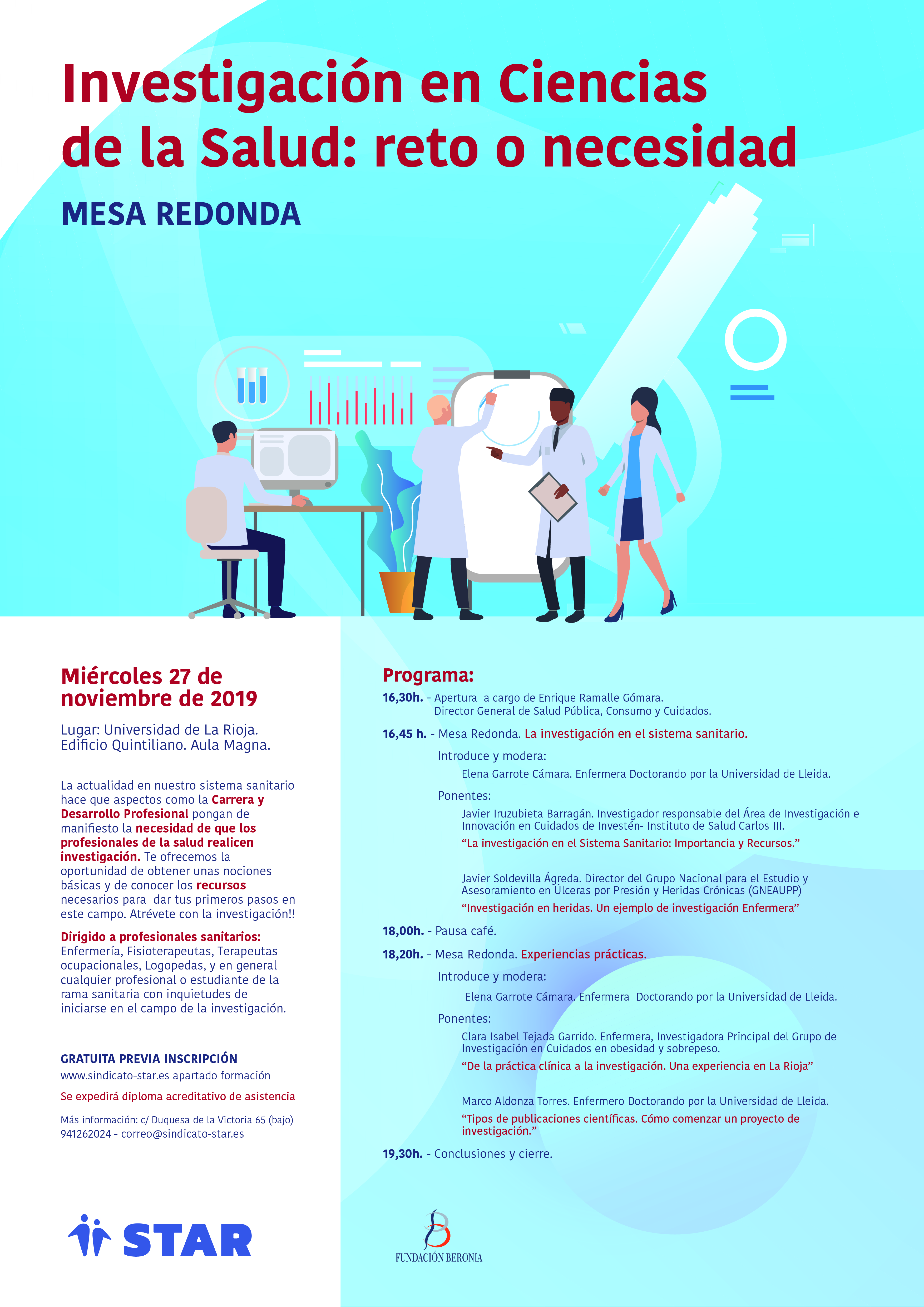 Necesario para progresar en la CARRERA PROFESIONAL.Te ofrecemos la oportunidad de concocer los recursos necesarios para dar tus primeros pasos en el campo de la INVESTIGACIÖN. El próximo miércoles 27 de noviembre en el Aula Magna del Ed. Quintiliano de la UR.Jornada GRATUITA previa inscripción en el siguiente ENLACE