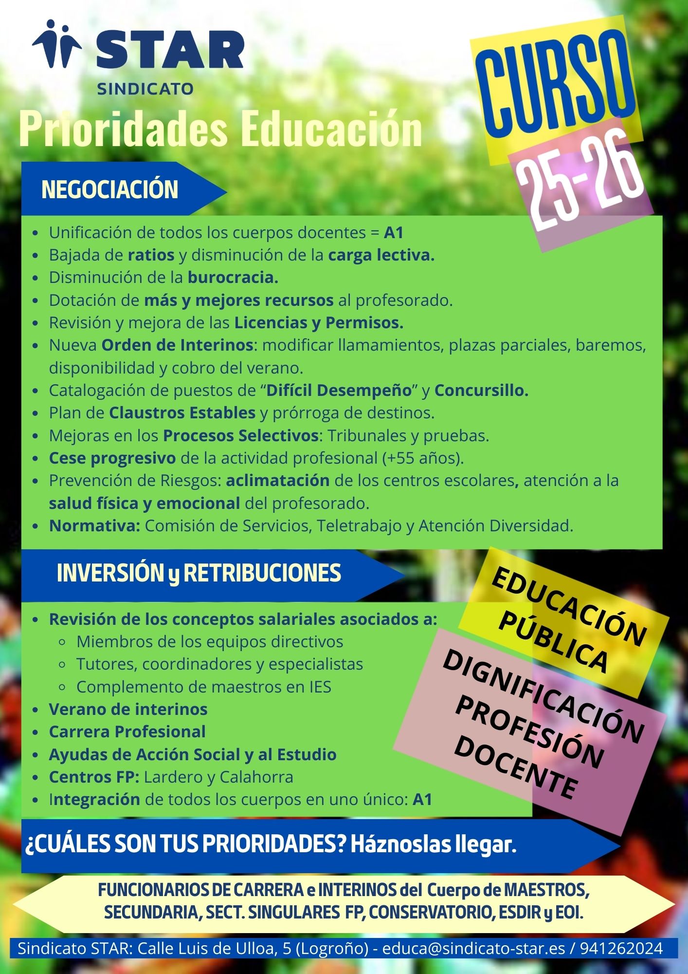 Tras los avances conseguidos en curso anterior, fruto del Acuerdo firmado por STAR en septiembre del curso pasado, comenzamos nuevo curso y quedan muchos otros asuntos que STAR va a poner sobre la Mesa. A continuación puedes ver las prioridades que desde STAR nos marcamos para trabajar en este curso 25/26. Puedes hacernos llegar cualquier inquietud o aportación a Esta dirección de correo electrónico está siendo protegida contra los robots de spam. Necesita tener JavaScript habilitado para poder verlo.. Sigue leyendo para ver los objetivos marcados.