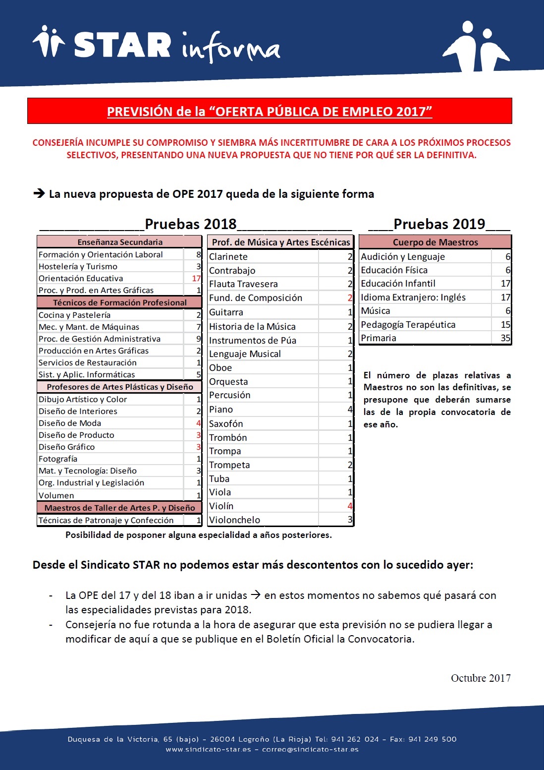 A continuación puedes ver la nueva propuesta de la Administración en relación a la Oferta de Empleo Público Docente de 2017. Para cualquier duda contacta con nuestro Sector de Educación.