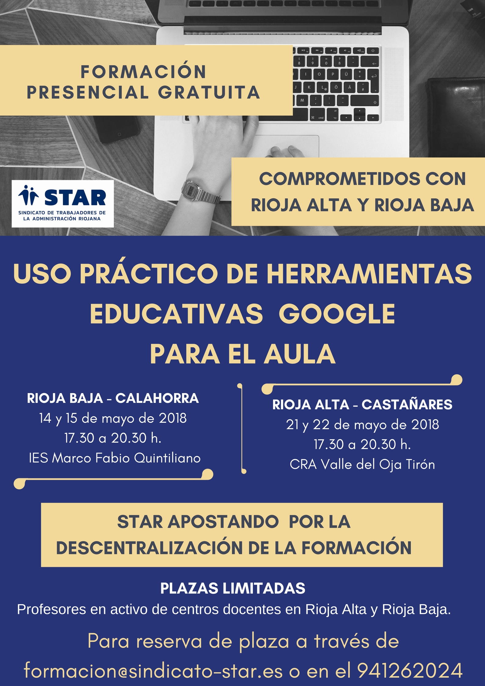 STAR ofrece FORMACIÓN PRESENCIAL para el personal docente en RIOJA ALTA Y RIOJA BAJA. Continuamos con nuestra campaña para la "Descentralización de la Formación" siendo conscientes de la dificultad que supone la centralizacion existente en cuanto a formación presencial, para los docentes que no viven en Logroño o alrededores. Por ello iniciamos en mayo el curso " Uso práctico de herramientas Educativas Google para el aula", que se desarrollará en Rioja Alta y en Rioja Baja. A continuación puedes ver las fechas concretas y más información.
