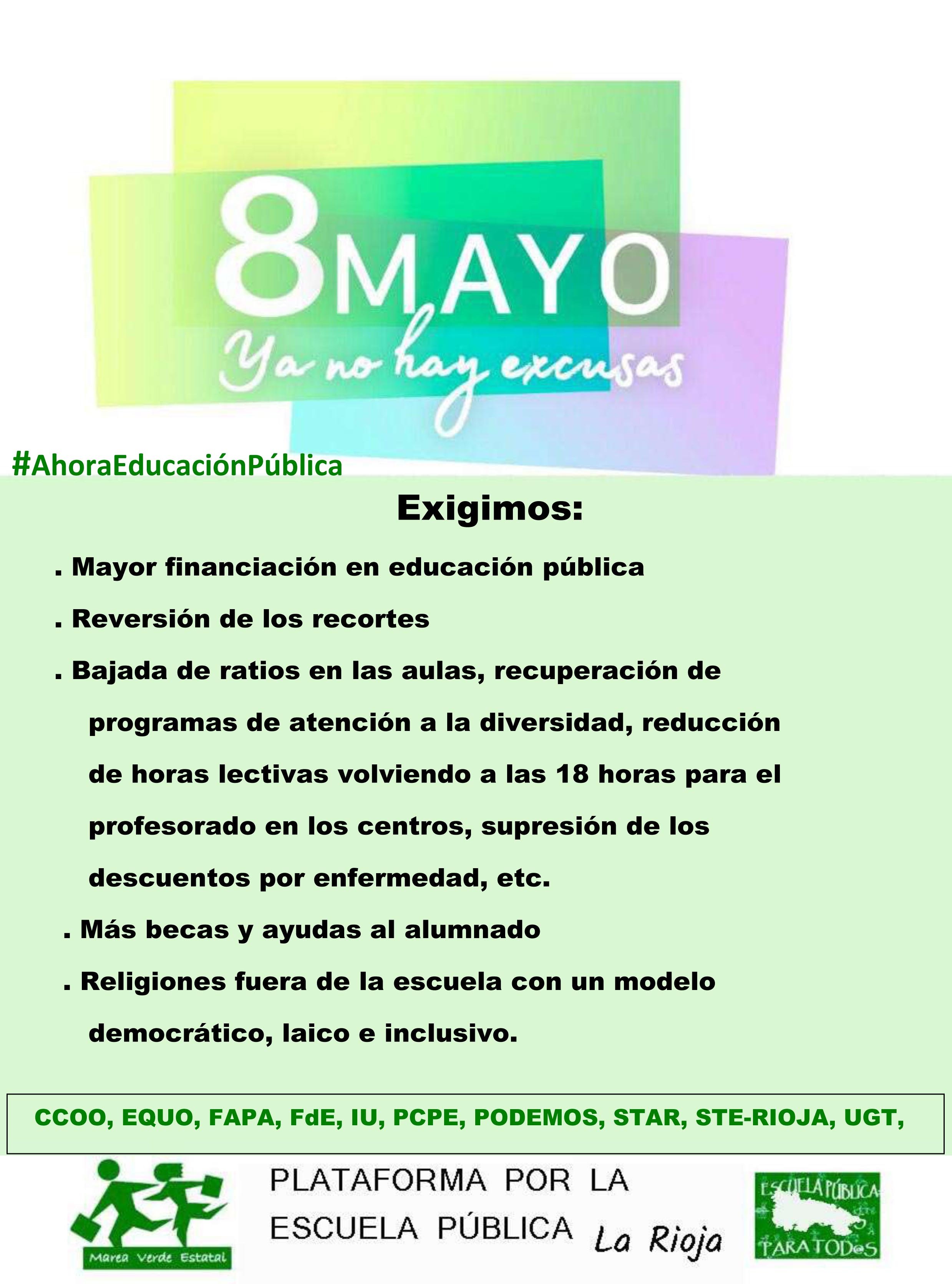 Este martes 8 de mayo la Plataforma por la Escuela Pública convoca una concentración por la Educación Pública.