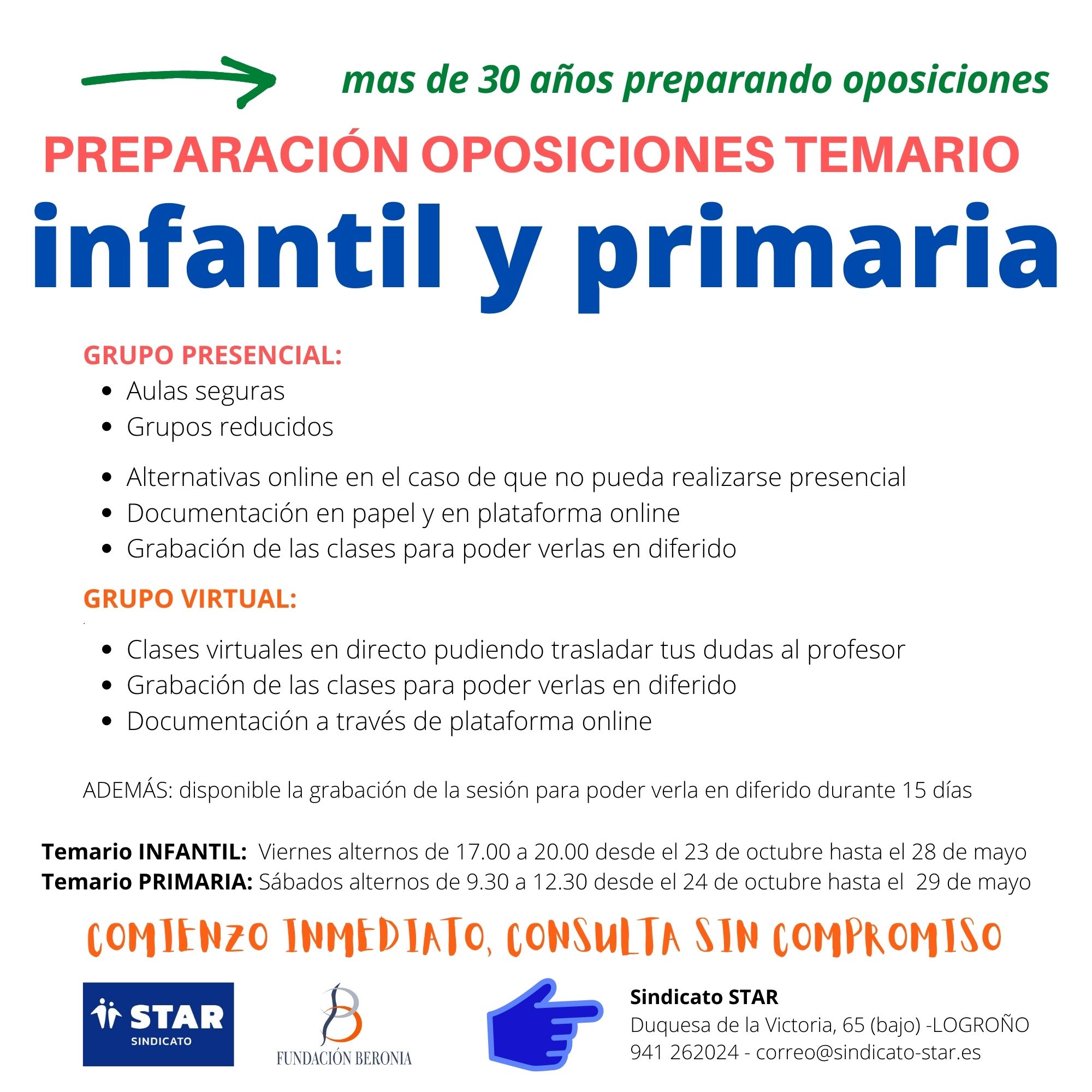 Comenzamos con la preparación de oposiciones para INFANTIL Y PRIMARIA.- Formación presencial y/o virtual. Comienzo inmediato de grupos. A continuación puedes ver más información sobre horarios y grupos. Si tienes dudas contacta con nosotros sin compromiso!!