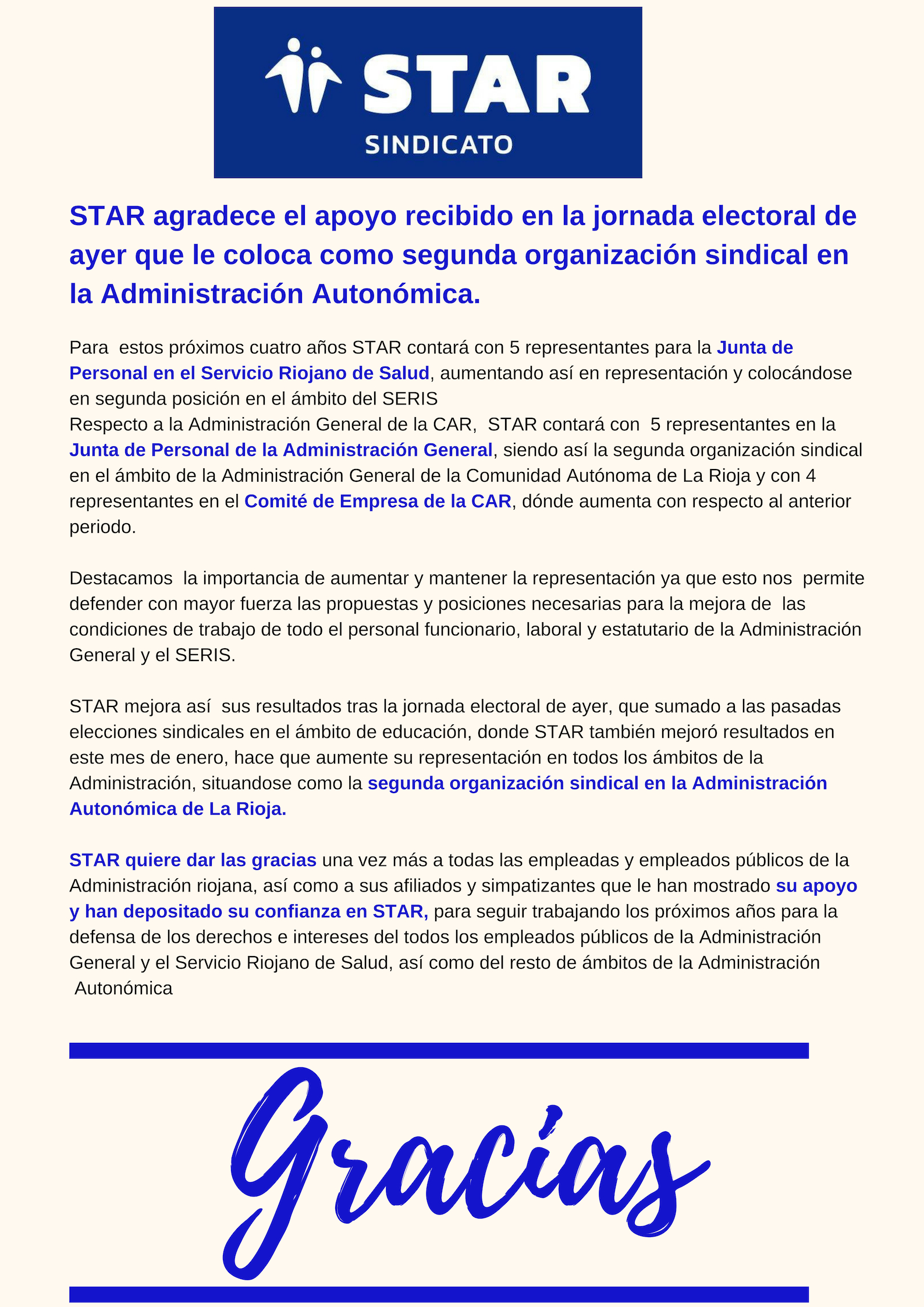STAR agradece el apoyo recibido tras la jornada de elecciones sindicales de ayer STAR se coloca segunda posición tanto en la Administración General de la CAR como en el Servicio Riojano de Salud, aumentando así su representación en todos los ámbitos de la Administración autonómica.