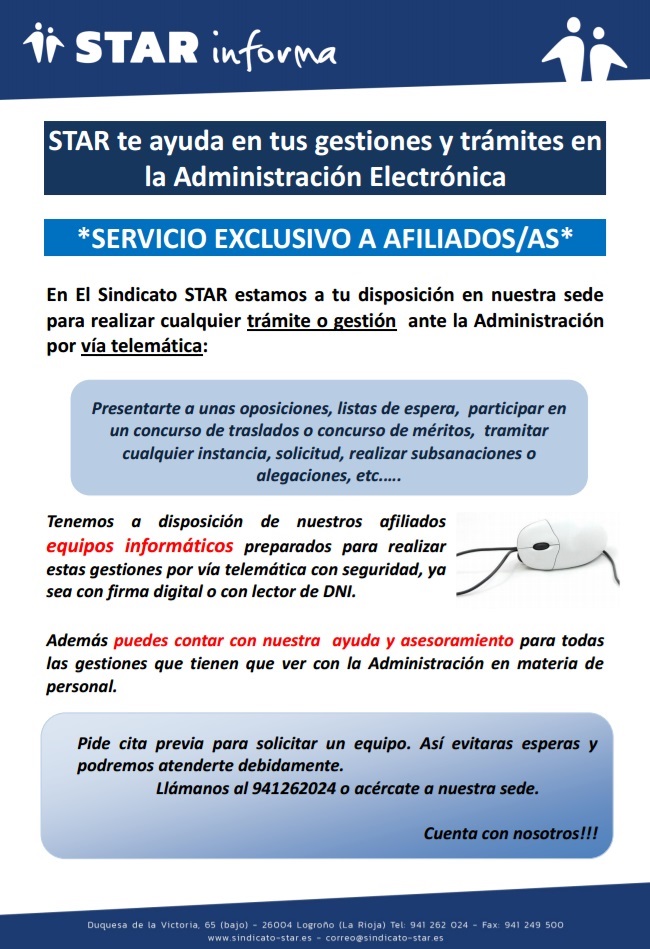 STAR ofrece a todos sus afiliados apoyo para realizar cualquier trámite o gestión ante la Administración por vía telemática:Concursos de traslados, oposiciones, concurso de méritos , realizar subsanaciones o alegaciones, tramitar cualquier instancia o solicitud, firma eléctrónica, etc…..