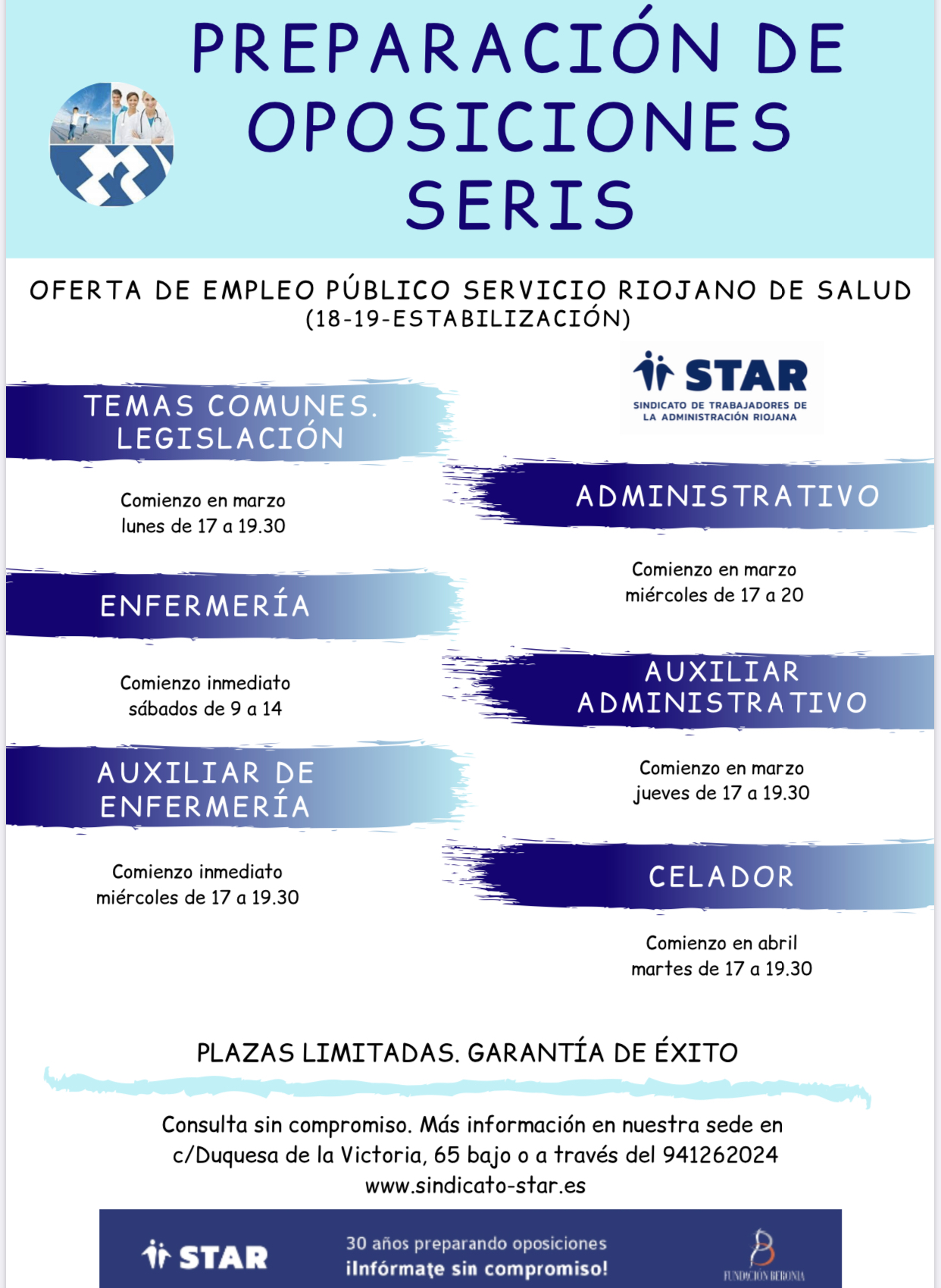 Prepara con éxito tus oposiciones para el SERVICIO RIOJANO DE SALUD, VARIAS CATEGORIAS.Comenzamos... Informate sin compromiso !