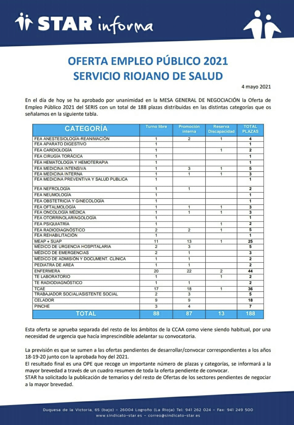 En el día de hoy se ha aprobado por unanimidad en la MESA GENERAL DE NEGOCIACIÓN la Oferta de Empleo Público 2021 del SERIS con un total de 188 plazas distribuidas en las distintas categorías que os señalamos en la siguiente tabla.