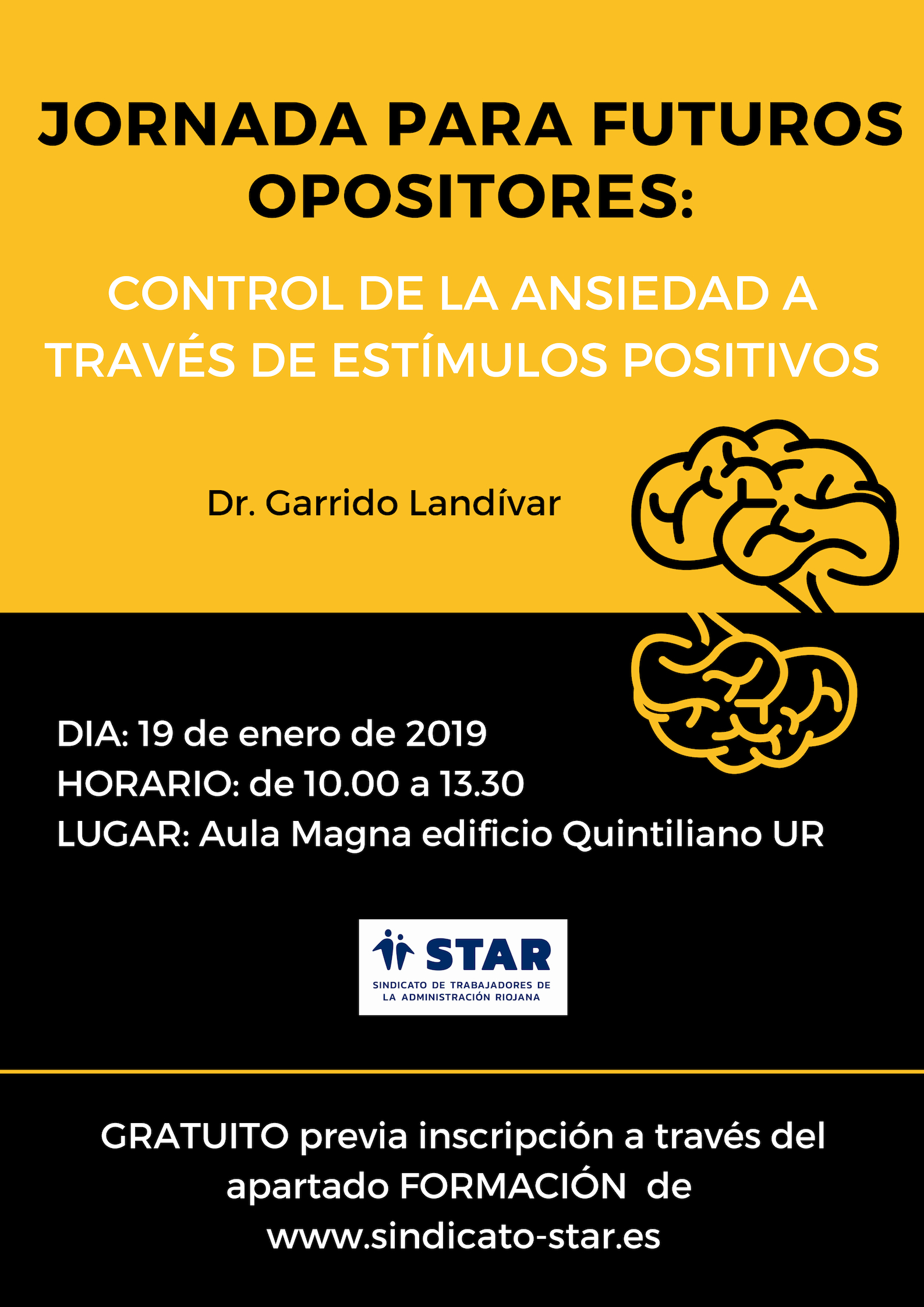 19 de enero de 2019.-Jornada gratuita para futuros opositores impartida por el Dr. en Psicología D. Emilio Garrido Landívar. Aprende a gestionar la ansiedad a través de estímulos positivos. Gratuito previa inscripción. ENLACE