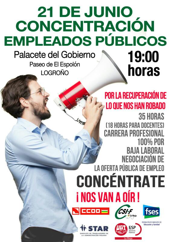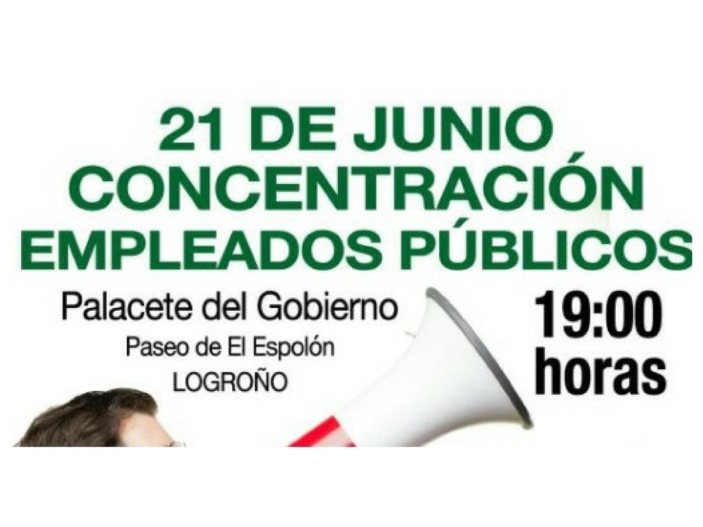 STAR y el conjunto de organizaciones sindicales con representación en Mesa General de la Administración Riojana , convocan una concentración el día 21 de junio a las 19.00 horas frente al Palacete del Gobierno de La Rioja.
