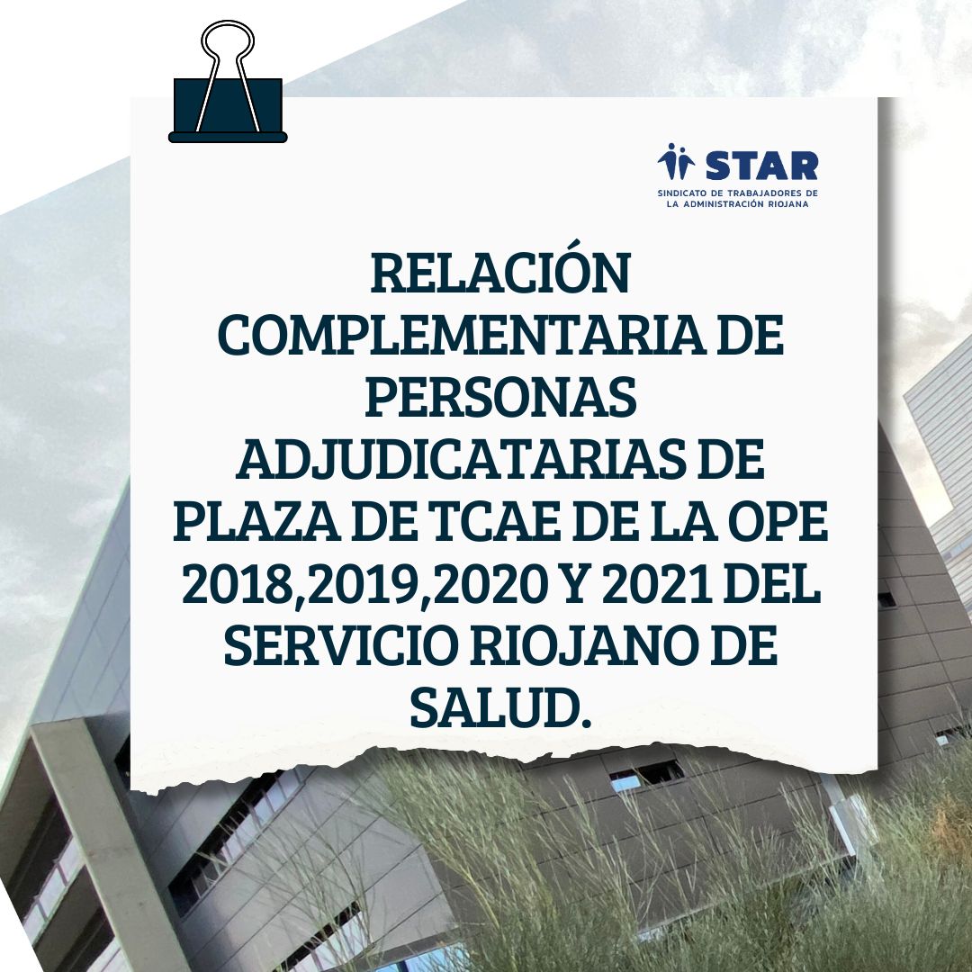 Se ha publicado en el Boletín Oficial de La Rioja el listado complementario de personas adjudicatarias de plaza de TCAE correspondiente a la OPE 2018,2019,2020 y 2021 del Servicio Riojano de Salud.