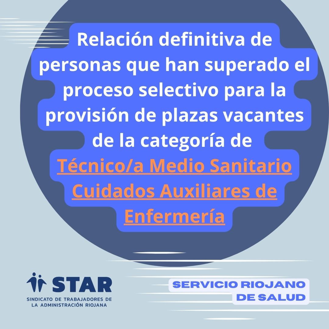 Resolución del Servicio Riojano de Salud, por la que se hace pública la relación definitiva de personas que han superado el proceso selectivo para la provisión de plazas vacantes de la categoría de Técnico/a Medio Sanitario: Cuidados Auxiliares de Enfermería, turno libre, turno de promoción interna y cupo de reserva de personas discapacitadas.